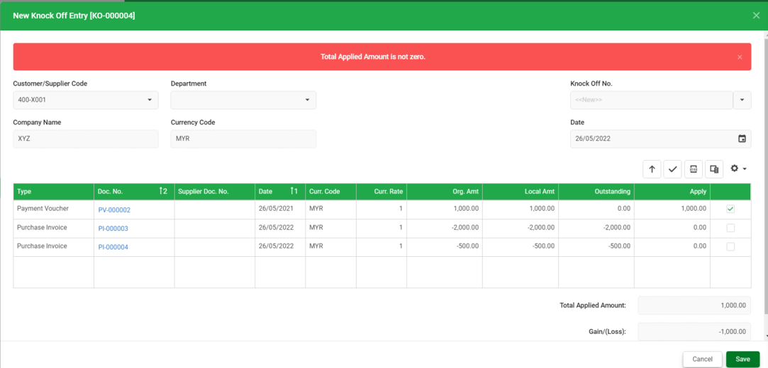 Why can’t I save Knock Off Entry? There is a message prompted “Total Applied Amount is not zero”.