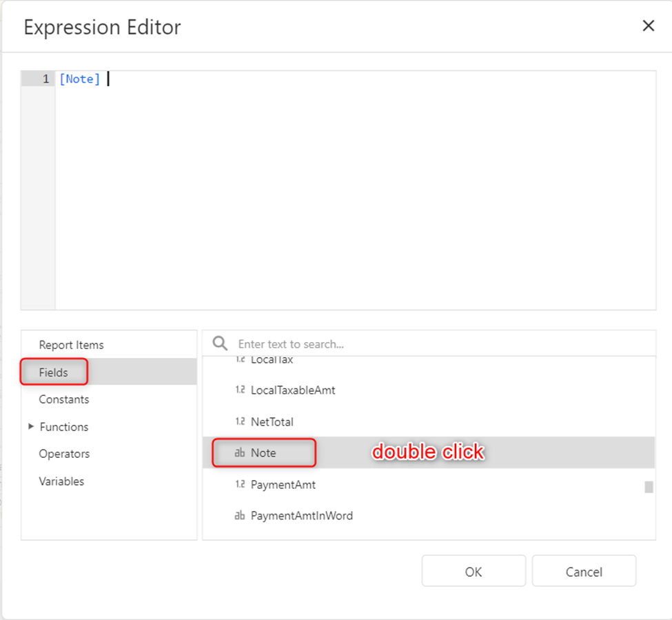 4) Expression Editor will pop up and find the “Note” in the Fields and double click on it. The Expression Editor box will show [Note], then click on OK.