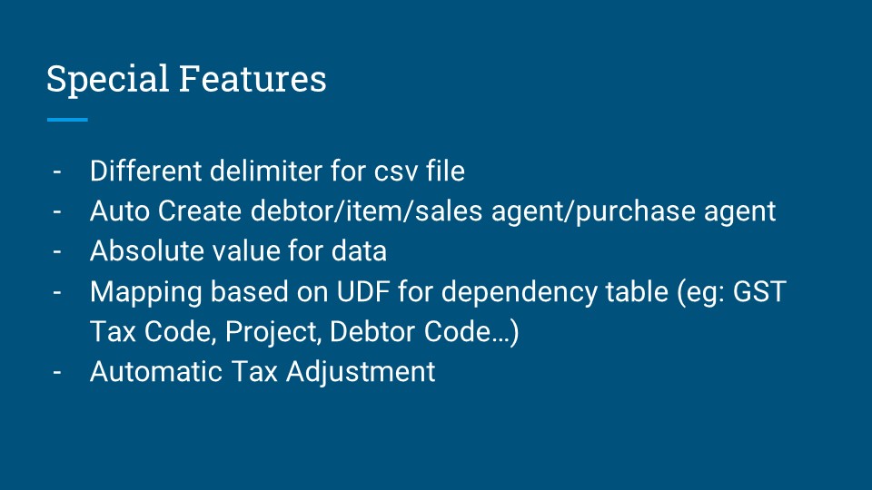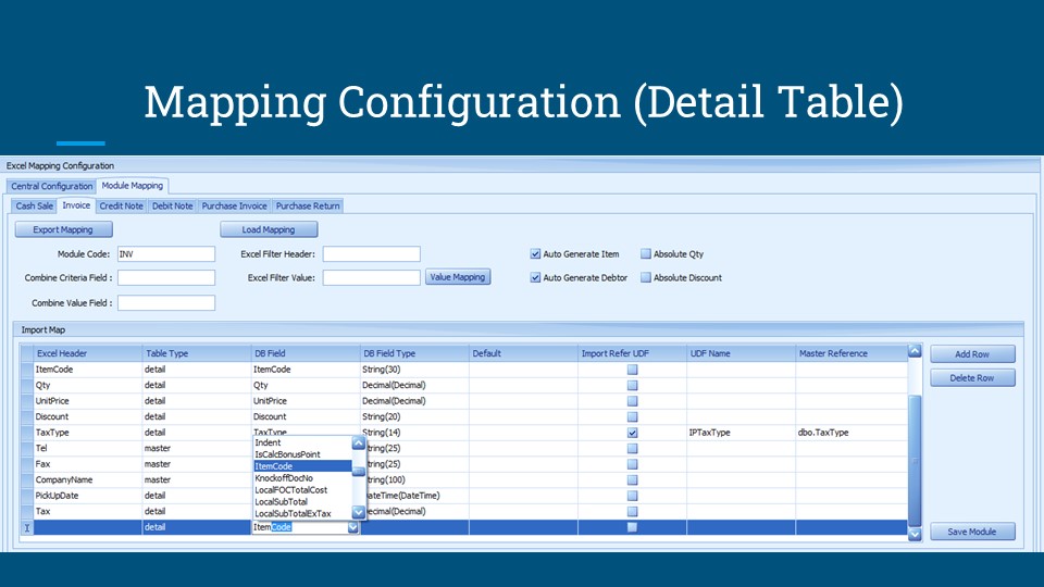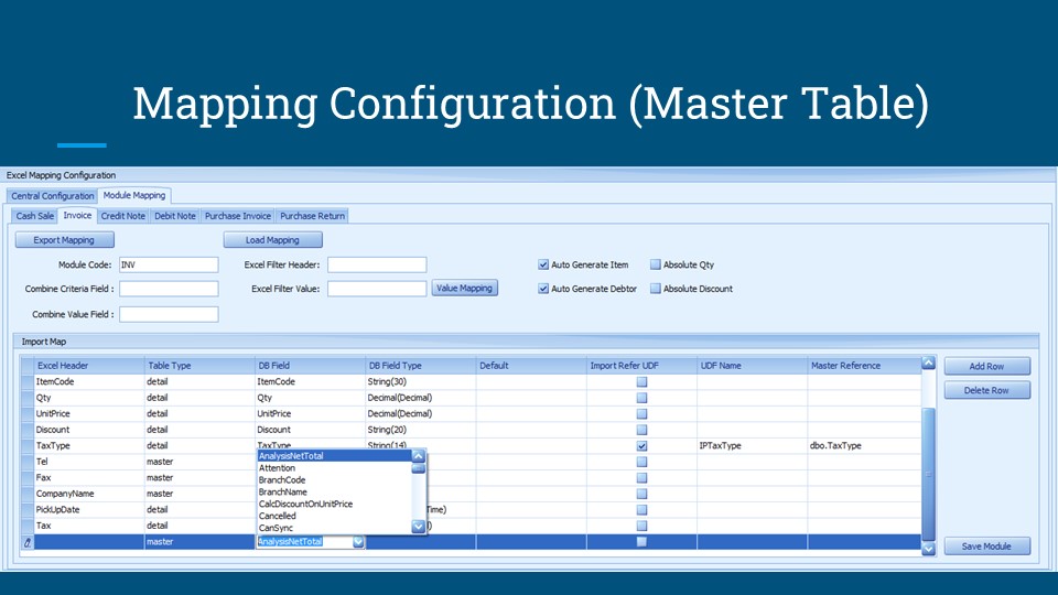Supports mapping based on User-Defined Fields (UDF) for dependency tables (e.g., GST Tax Code, Project, Debtor Code).