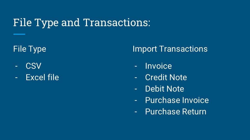 Supports multiple transaction types: Invoice, Credit Note, Debit Note, Purchase Invoice, and Purchase Return.